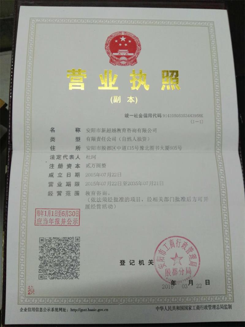 安陽(yáng)市新超越教育咨詢有限公司,是教師招教培訓(xùn)的文化教育培訓(xùn)機(jī)構(gòu)。她坐落在甲骨文的發(fā)現(xiàn)地,周易的故鄉(xiāng),岳飛的故里,紅旗渠精神的搖籃------河南安陽(yáng)。為了民族教育的振興,為了安陽(yáng)三千年文化的傳承,她努力打造著屬于豫北本土的職業(yè)培訓(xùn)教育!